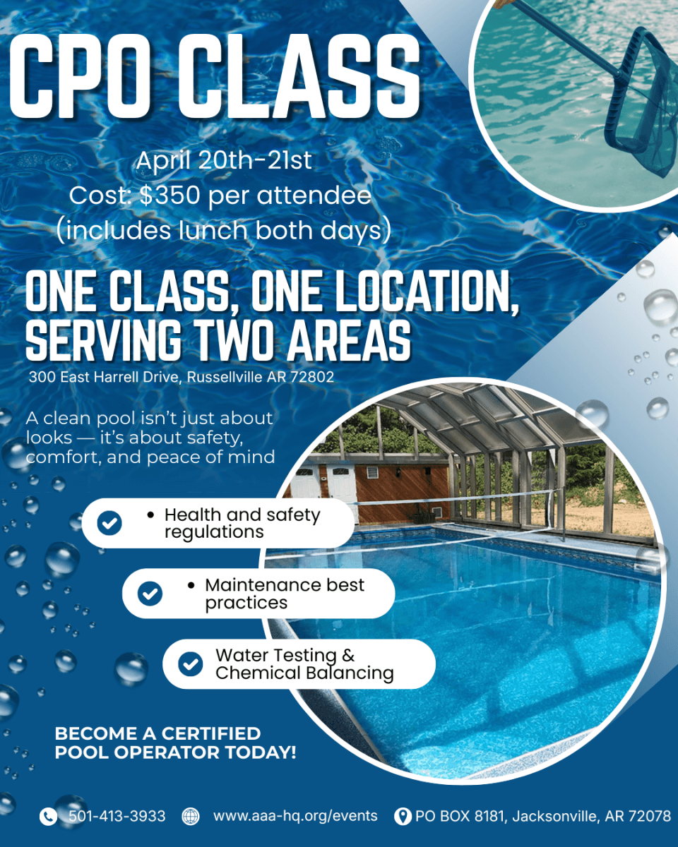 Join us for a comprehensive Certified Pool Operator (CPO) Certification Course hosted at the Holiday Inn Express & Suites in Russellville. This two-day course is designed for property management professionals, maintenance teams, and anyone responsible for pool operations and safety.